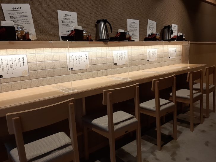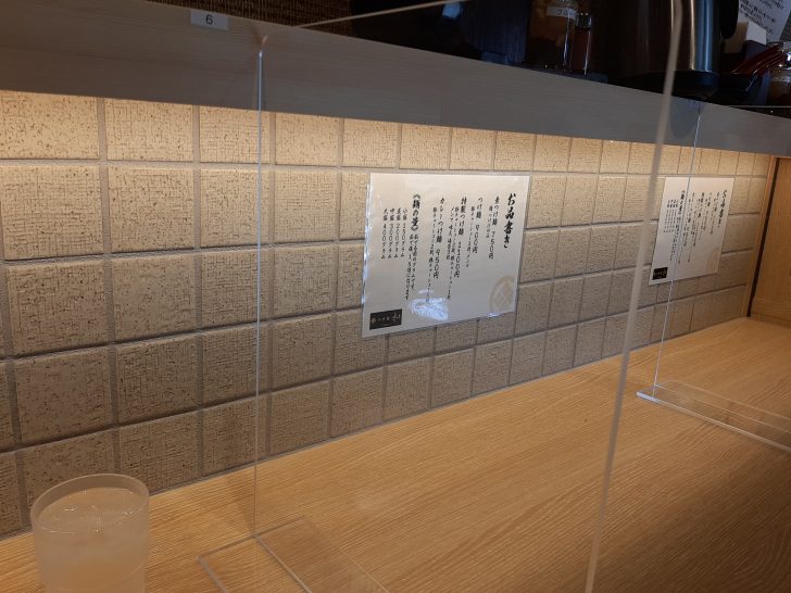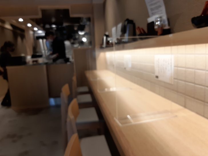 席は15席でカウンターのみになっています。各席は隣の席とアクリル板で仕切ってありました。また、お客様が帰られると、アルコール消毒していましたので、コロナ感染防止対策も万全ですね。
