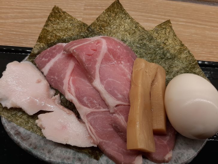 具材は別皿で提供されます。海苔3、低温調理豚レアチャーシュー2、鶏チャーシュー1、メンマ3、煮玉子1、海苔の下にネギも少しありました。レアチャーシューは食感も良くつけ汁に付けると旨い。鶏チャーシューも胸肉なのにしっとりとして旨かったですね。太メンマも柔らかくて、味付けも良かったです。海苔はパリッと感がなかったですね。