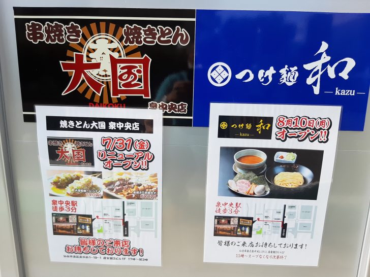 泉中央駅から西へ徒歩3分の居酒屋などがたくさん入居している遊食館2の1Fの焼きとん『大国』泉中央店の隣に出店しました。『大国』の出店スペースを削減して、そこに出店しました。焼きとん『大国』泉中央店は、7月31日にリニューアルオープンしていましたが、『つけ麺和』泉中央店のオープンはかなり遅れて、8月10日にようやくオープンしました。今日は、新規オープン日なので行列だろうと思い、熱中症になるのもいやなので、15:00過ぎに行きました。さすがに、この時間になると行列はなかったです。先客は2人でしたが、昼の部は私で最後?だったようです。なのでゆっくりと食事できました。