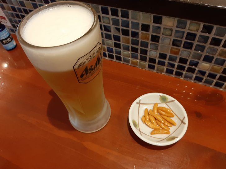 まずは、生ビール中(アサヒスーパードライ)【450円】を注文。おつまみに柿のタネがついてきますが、お通し代は取られません。