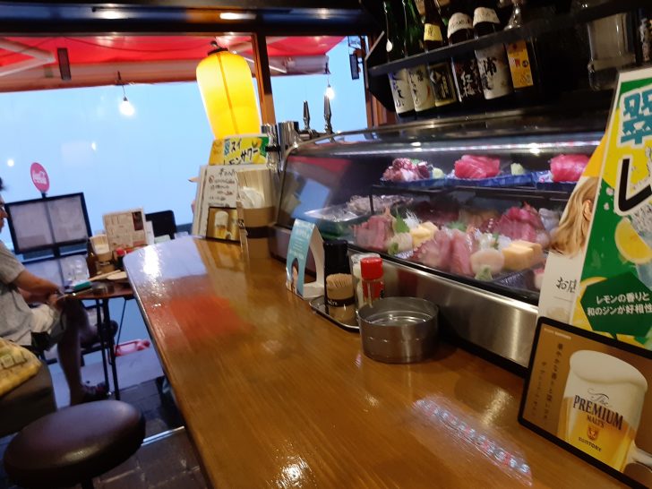 まるで寿司屋さんのようにカウンターにはネタケースがあり、海鮮がたくさんあります。