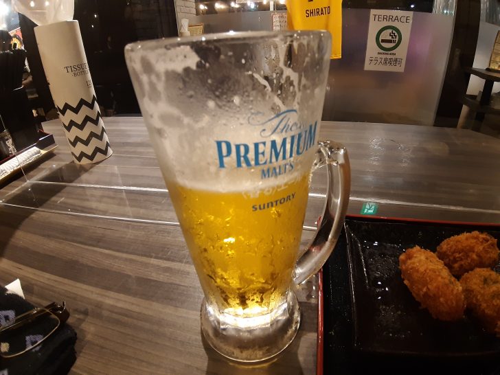 葵コースは、ドリンク2杯(生ビールは1杯のみ)+おつまみ3品ですね。これで1,000円です。安いですねー!まずは、生ビール(プレモル)を注文しました。