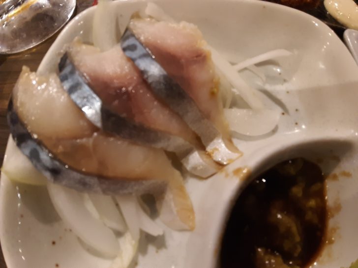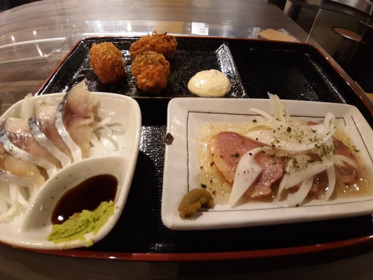 3品のおつまみも、凝っていて美味しそうですよね。1品目は、しめ鯖、2品目は、合鴨スモークのカルパッチョ、3品目は、カキフライです。おつまみが提供されるまでに少し時間が掛かりますが、旨いおつまみが提供されますよ。