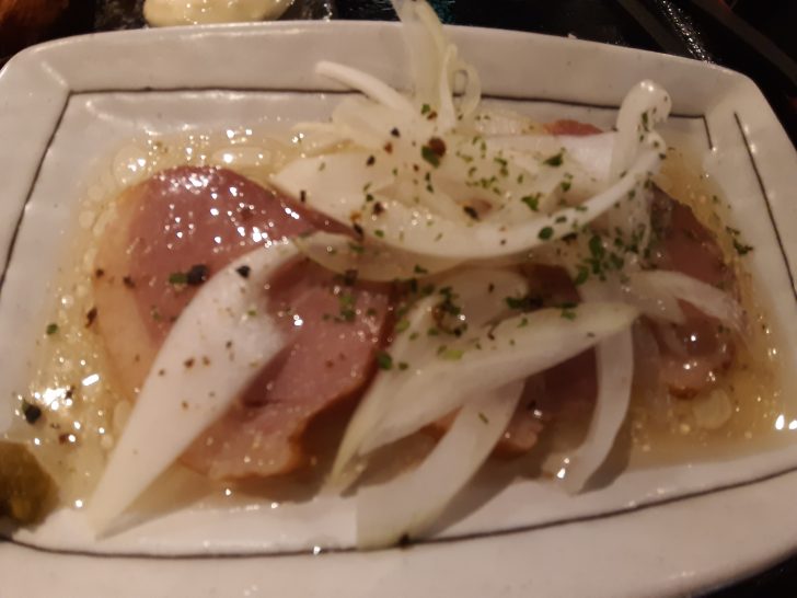 合鴨スモークのカルパッチョは、立ち飲み屋では中々ないおつまみですね。とても旨かったです。
