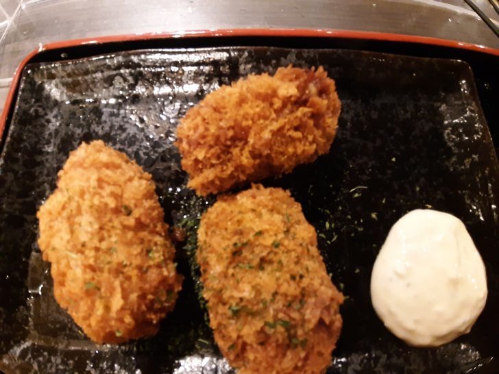 カキフライは3個です。揚げたてのカキフライは、タルタルソースを付けて食べると、旨いです。