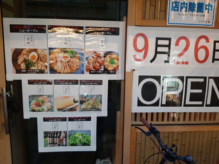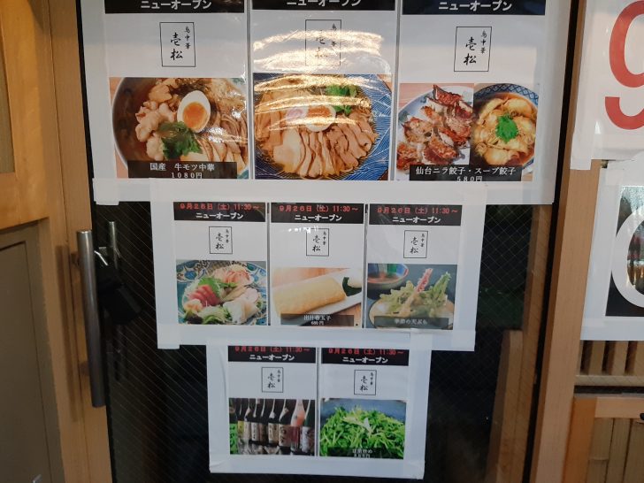 9/26(土) 11:30オープンと大きく掲示されていますね。ラーメンは、鳥中華と牛モツ中華の2つがメインのようですね。また、餃子もおすすめなんでしょうね。夜は居酒屋になるようですね。刺身、天ぷら、出汁巻き玉子などのおつまみと日本酒の品揃えが豊富なようですね。
