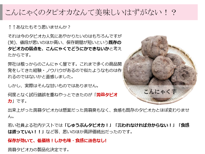 群馬が誇る特産品こんにゃくの市川食品がつくる「ブラックタピオカこんにゃく」は、タピオカそっくりの見た目に加え、ヘルシーで扱いやすいこんにゃくの特徴が生かされている。タピオカにはない利点もある。まずはカロリー。タピオカに比べ、こんにゃくは低カロリーでヘルシーなので、食べ過ぎても太るということはありません。次に調理のしやすさ。タピオカは湯戻しなどが必要だが、こんにゃくなら不要です。さらに、長時間飲料に入っていても伸びないこと。タピオカはゆでた後に放置すると、ふやけてしまうが、こんにゃくなら、そんな心配は必要ありません。
