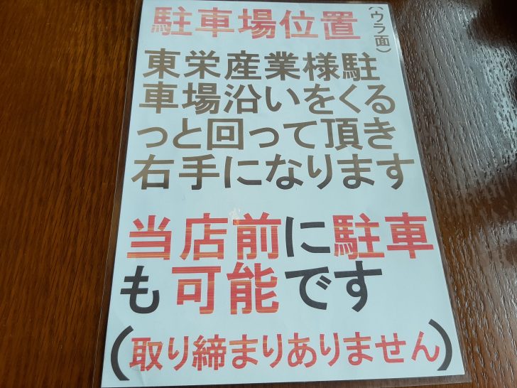 駐車場が空いていない時は、店舗の前に路駐して大丈夫とのことです。この道路は駐車禁止ではないようです。お店の方も取り締まりが無いと太鼓判を押してくれています。なので、駐車場が空いていない場合は、気にせず、店舗前に路駐しましょう。