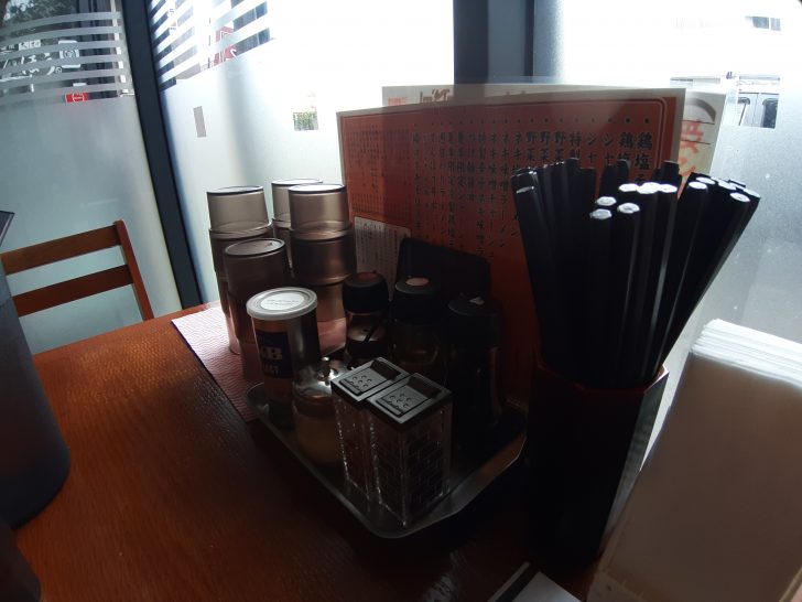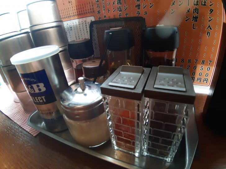 卓上調味料は、ブラックペッパー、にんにく、一味唐辛子、赤紫蘇ふりかけ、ラー油、酢、醤油です。