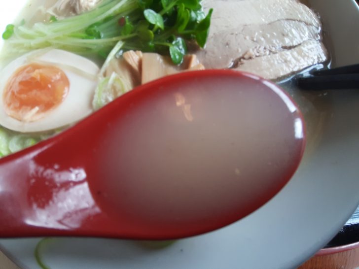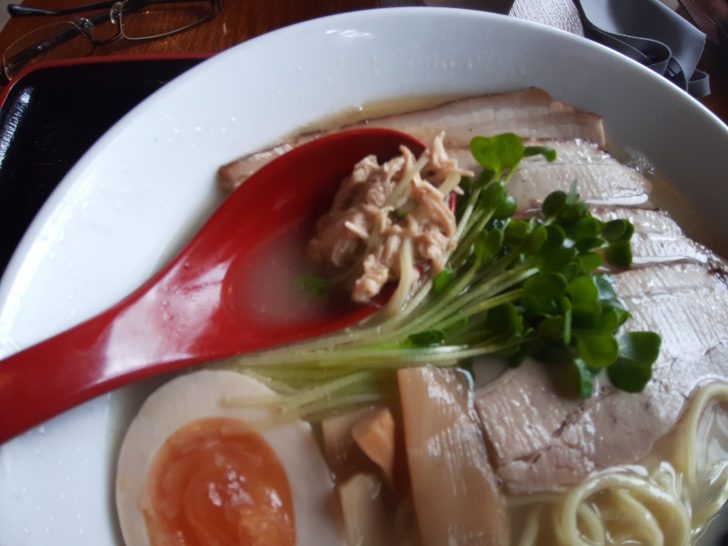 今回は初めての訪問だったので、一押しの鶏塩そばを注文しました。具材は、チャーシュー(今回はトッピングで3枚追加)、味玉半分、メンマ、カイワレ、ねぎ、鳥肉フレークですね。