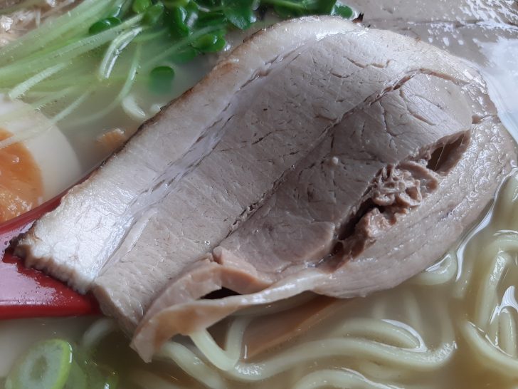 チャーシューは厚くはないですが、味付けも丁度良く旨いですね。今回はチャーシューを3枚追加したので、食べ応えがあります。