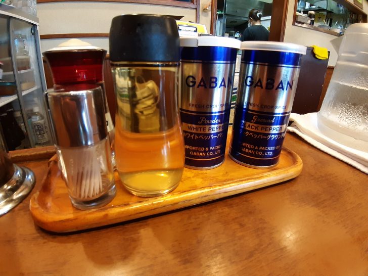 卓上調味料は、醤油、ラー油、酢、ホワイトペッパー、ブラックペッパーですね。