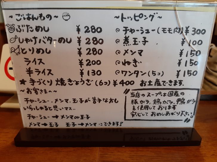 一番人気の東京(えど)ブラックを注文しました。他にも中華そば(塩・醤油)、東京(えど)そば、味噌もありますが、なんといっても、東京屋の名物は東京(えど)ブラックですね。このラーメンは病みつきになる人がたくさんいるそうです。トッピングは、豚バラチャーシュー、鶏もも肉チャーシュー、煮玉子(半分)、メンマ、ねぎ、三つ葉、海苔(魚粉)が載っていて、この値段はお得ですね。