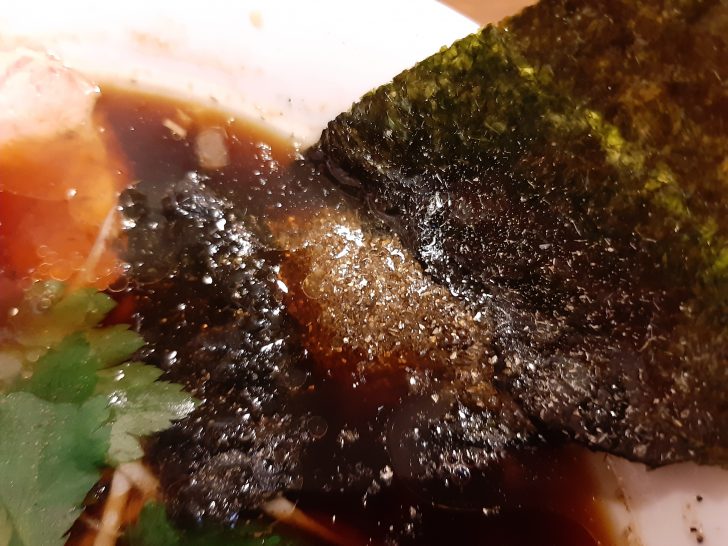 海苔には魚粉が載った状態で提供されました。途中からスープに入れて魚系の旨みを更にプラスしていただきました。