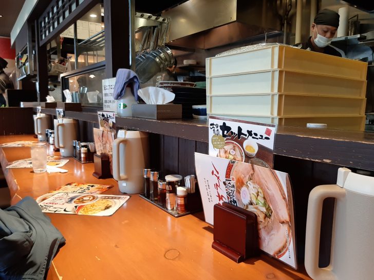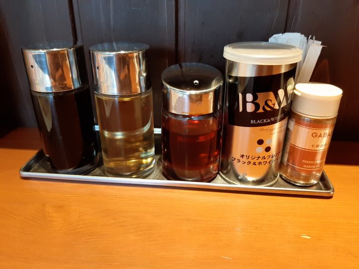 卓上調味料は、醤油、酢、ラー油、オリジナルペッパー、七味唐辛子ですね。
