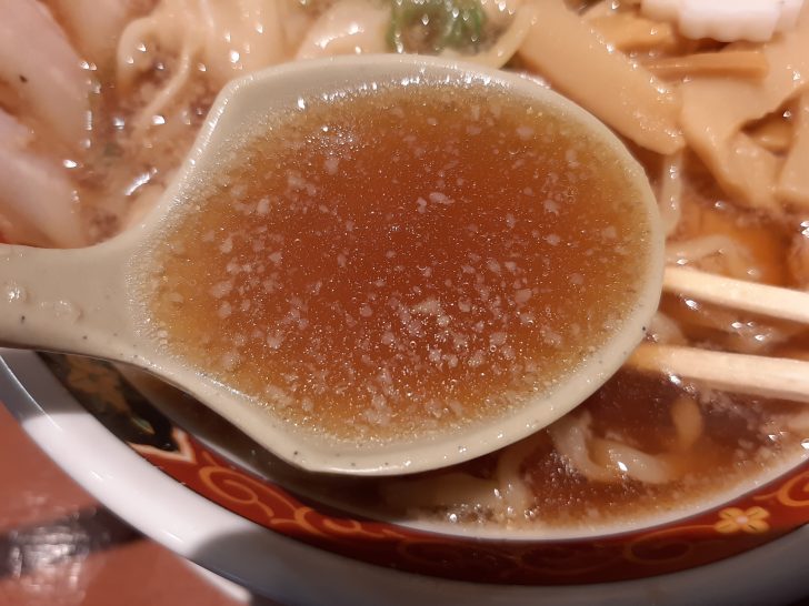 スープは、あっさりとした醤油味ですね。ただ背脂がたくさん入っている為、コクはあります。スープは旨いんですが、何か物足りないような気がします。