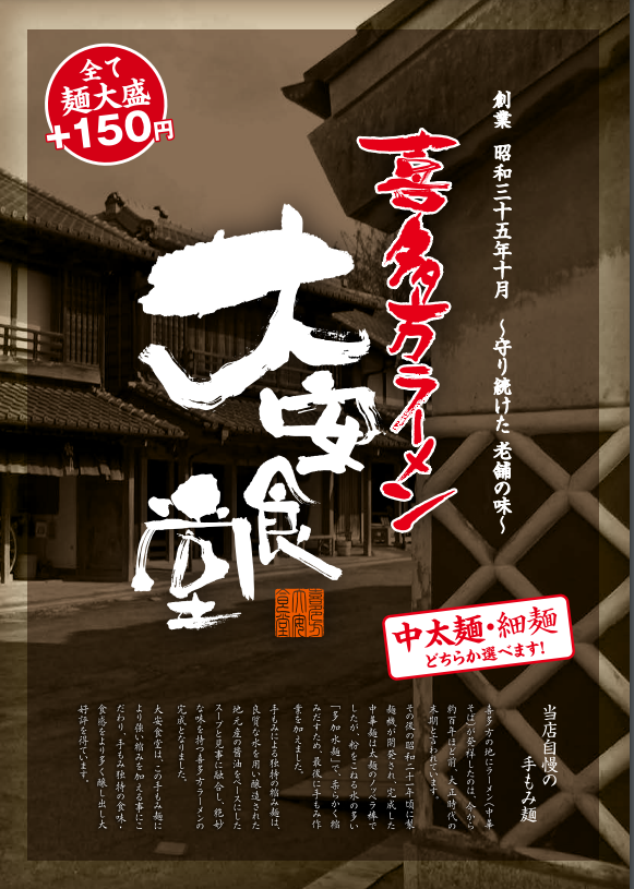『大安食堂』は、昭和35年創業の喜多方ラーメン大安食堂は福島県喜多方市で50年の実績あるラーメン店です。喜多方ラーメンは醤油味がベースになっていますが、その店によって塩味、醤油味、その中間の味といったように違っています。麺は「平打ち熟成多加水麺」と呼ばれる約4mmの太麺で、水分が多く寝かせるのでコシと縮れがあります。更にこの麺に手もみ作業加えて独特の食味・食感を出しています。お店は現在、本店(喜多方市)、東堀店(新潟県新潟市)、鶴岡店(山形県鶴岡市)、仙台卸町店(宮城県仙台市)、仙台トラストシティ店(宮城県仙台市)の5店舗が営業中ですが、本店以外は、(株)キタカタという新潟の会社がFC展開を行っており、本店とは別物でメニューも異なるようです。