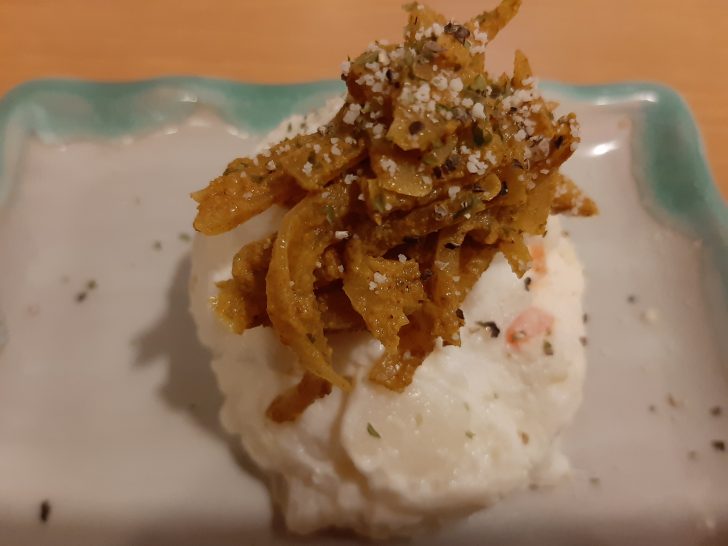 この店は、席料・お通しがないのが嬉しいですね。立飲み居酒屋とおなじですね。このポテトサラダは、変わっていて、ポテトサラダの上にカレー味の大根の漬物?が載っていて、これが旨いですね。