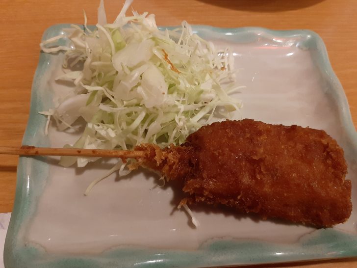 【一軒め酒場】の名物のひとつである、神田旨カツを注文しましたが、これには、ソースと和風の2種類があります。私はソースを選択しました。提供された時に衣にソース味が付いていました。普通に旨い串カツでした。