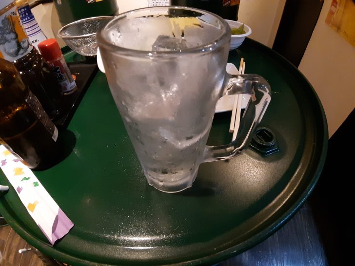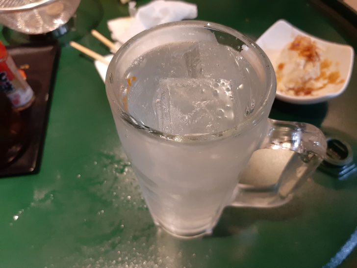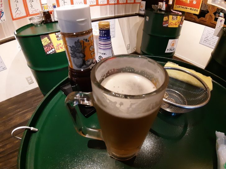 生中は250円と安いんですが、実は第3のビール(クリアアサヒ)です。ドラム缶の上のザルにお金を入れておいて、注文した品物はこの現金と引き換えになります。