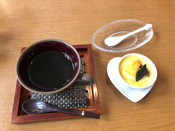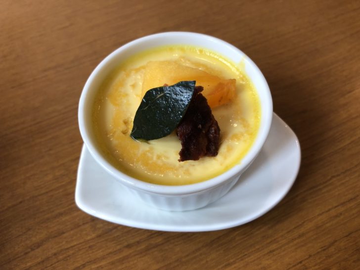 デザートはパンプキンプリンです。カボチャとカボチャの皮と栗が載っていました。トロトロして美味しかったです。