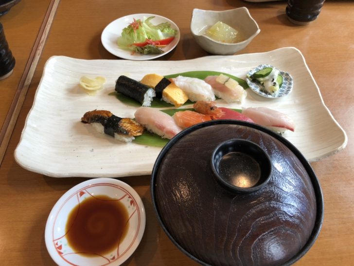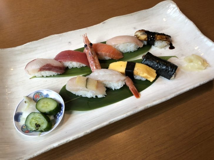 メインの寿司ですが、ブリ、マグロ、サーモン、カジキマグロ、うなぎ、ヒラメの昆布締め、ぼたん海老、厚焼き玉子、かんぴょう巻きですね。付け合わせは、きゅうりと白菜の漬物とガリ。シャリは小振りですが、ネタは新鮮で美味しいですね。