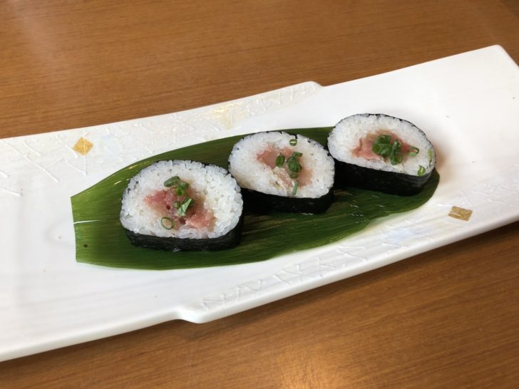 毎度サービスされるようですが、今回も大将からのサービスということで、ねぎとろの太巻きを頂きました。3人で行ったので、1個/人ですね。こちらも美味しかったです。