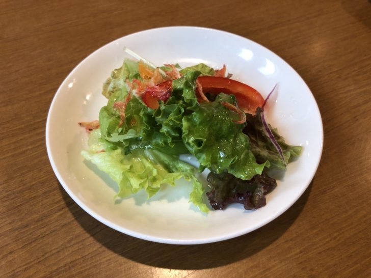 その次はサラダが出てきました。レタス、サニーレタス、オニオン、パプリカに桜エビが載ってました。酸味が強めの自家製?ドレッシングが良かったです。
