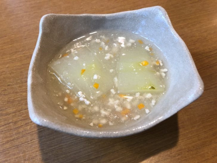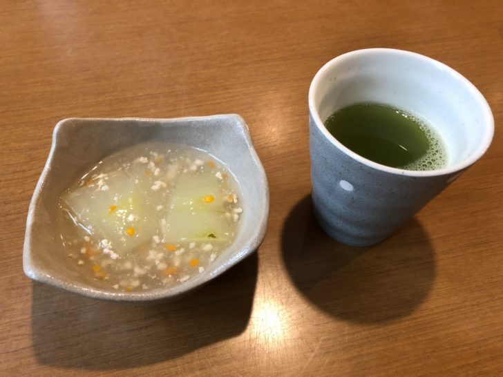 次にお茶と小鉢(冬瓜のそぼろ餡かけ)が提供されました。お茶も寿司屋のお茶だけあって美味しいですね。回転寿司のお茶とは違います。