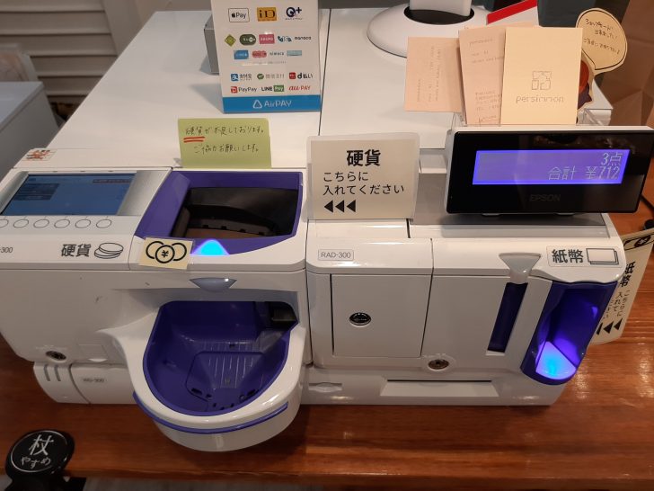 会計はお客様が自分でお金を入れて、お釣りも受け取るタイプの装置が導入されていました。最近はコロナ感染防止の為に導入されるお店が増えていますね。