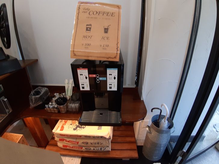 入口付近にはテイクアウトコーヒーの販売機があります。HOTは100円、ICEは150円とリーズナブルですね。