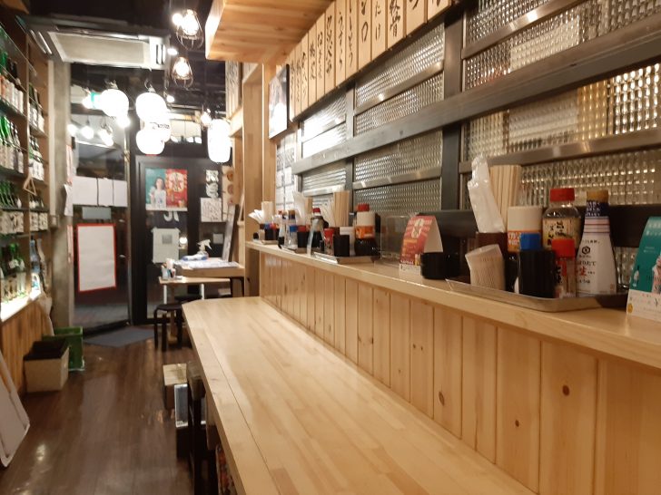 入口付近のカウンターとテーブル席です。入店すると検温とアルコール消毒をします。コロナ対策も万全ですね。