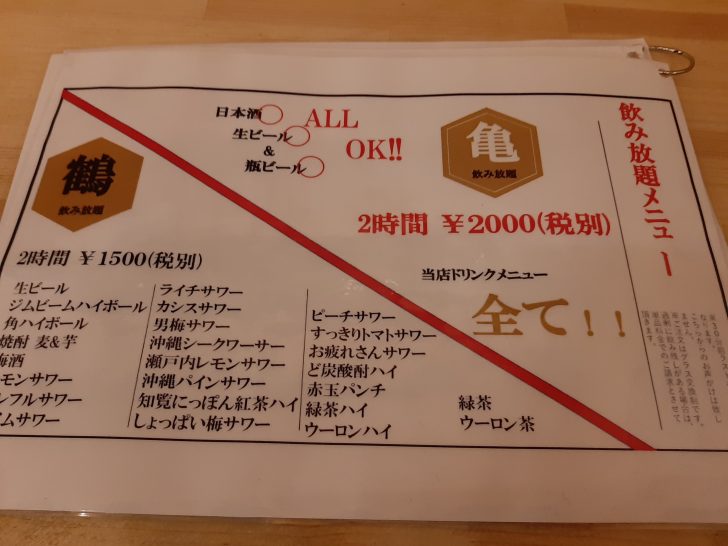 飲み放題メニューは【鶴1500円】と【亀2000円】の2種類あります。2000円飲み放題は、店内の全てのドリンクが飲み放題とのことですが、一応お店の方に確認しましたが、地酒18種類も含まれるそうです。