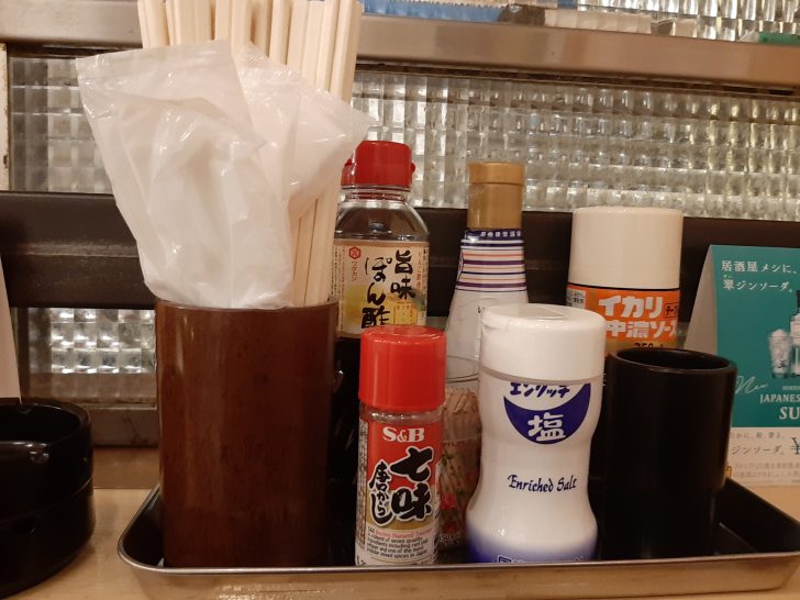 卓上調味料は七味唐辛子、塩、ポン酢、醤油、中濃ソースですね。