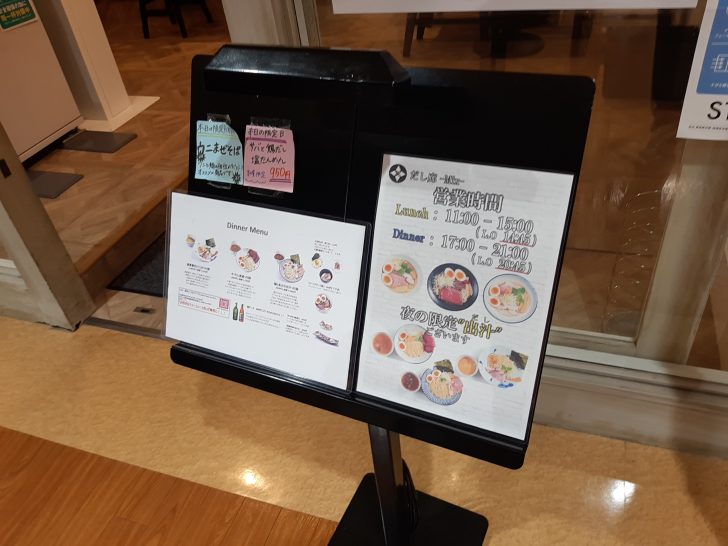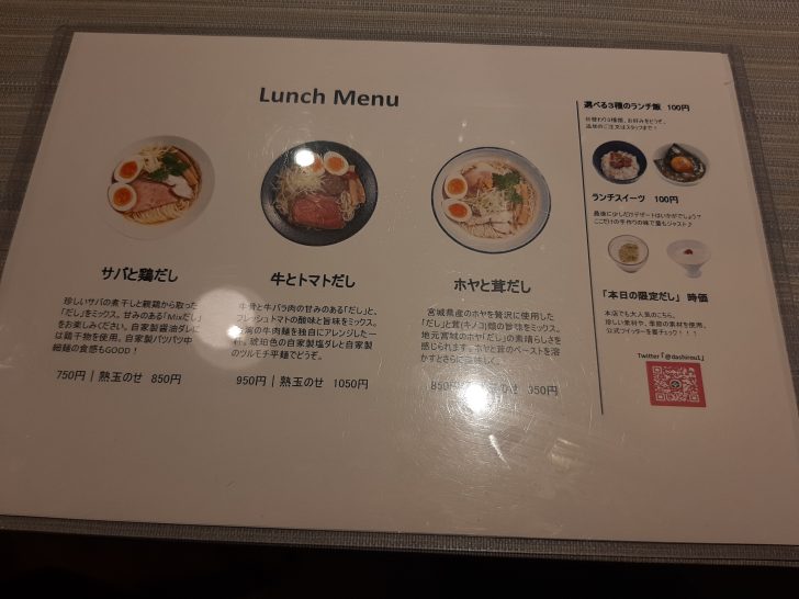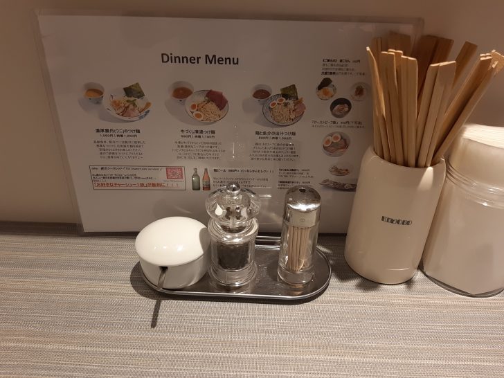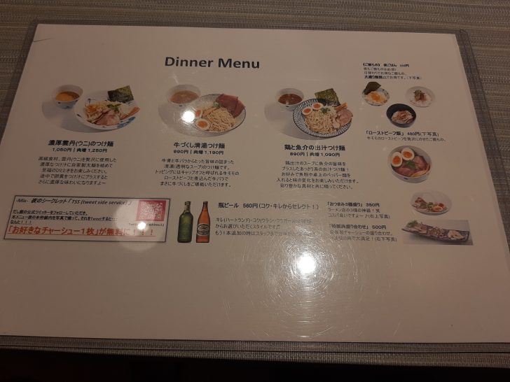 メニューには、Lunch MenuとDinner Menuがあります。ランチはラーメンで、ディナーはつけ麺でした。私は、仕事上ランチタイムには行けないので、ディナータイムに行くことが多いのですが、つけ麺はあまり好みでないので、これまで『だし廊MIX』には行きませんでした。それが、いつの間にか、ディナータイムでもラーメンを提供することになったので、今回行ってみました。