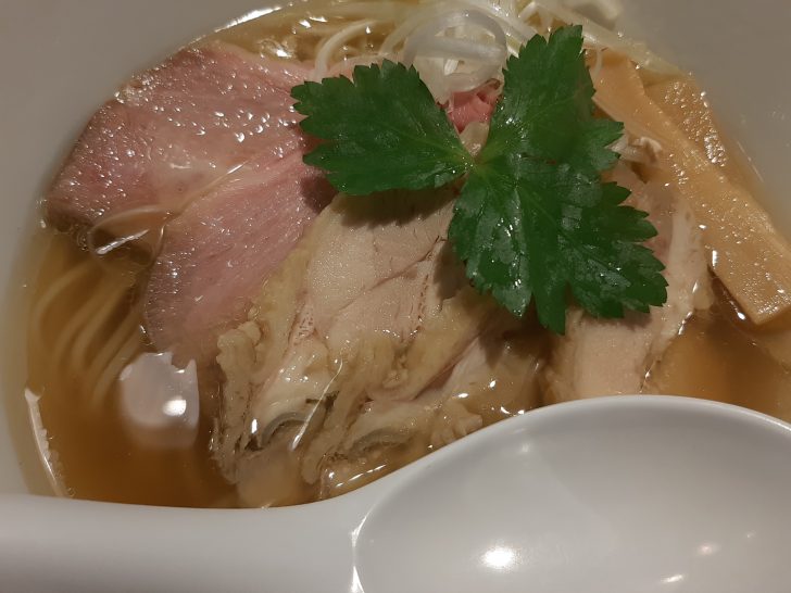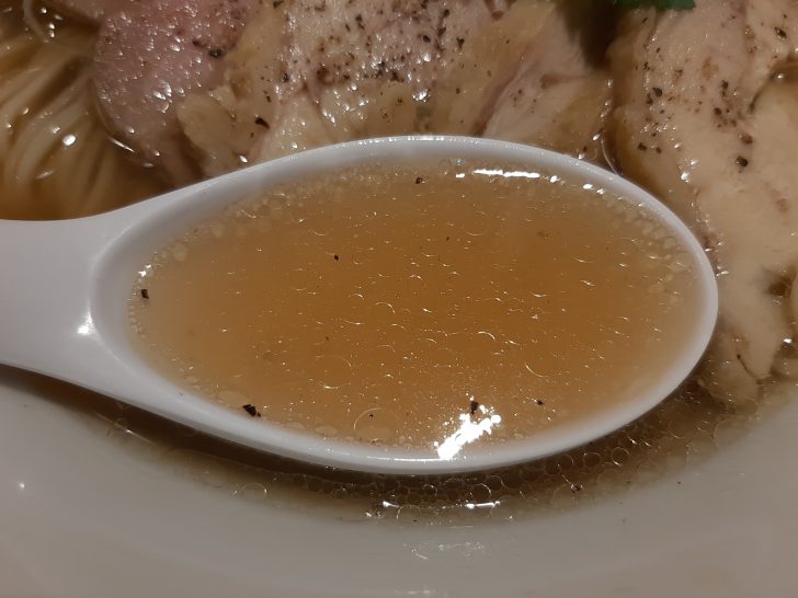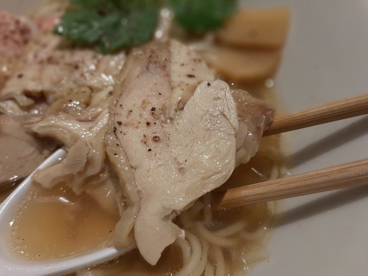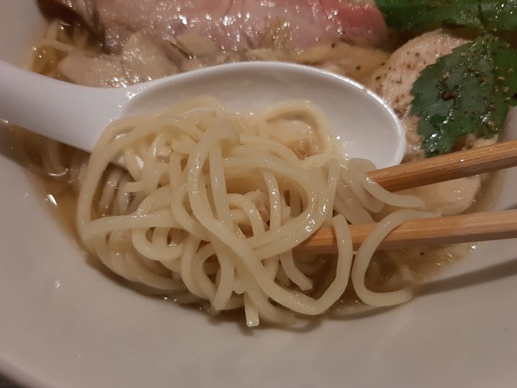 サバの煮干と親鶏からとった出汁と醤油だれを合わせたスープで、ひと口含むと魚介と鶏の旨味が感じられる、やさしい美味しさで、私の好きな味ですね。
