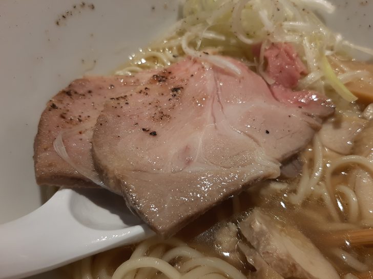 トッピングは、豚ロース低温調理チャーシュー2枚、親鶏チャーシュー2枚、メンマ、白髪ねぎ、三つ葉ですね。通常のラーメンは、チャーシューが1枚づつですが、チャーシュー麺にすると2枚づつになります。