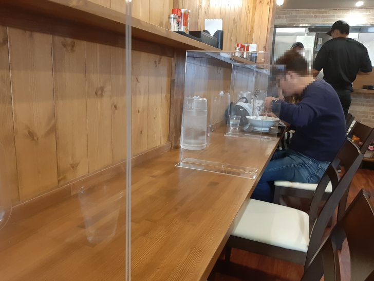 コロナ対策で、テーブル席もカウンターも隣の席とはアクリル板で仕切られています。コロナ対策は完璧ですね。