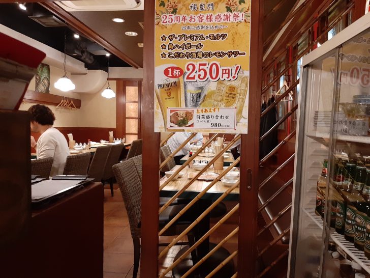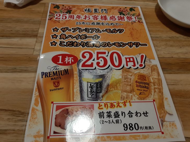 現在25周年お客様感謝祭を行っており、生ビール、ハイボール、レモンサワーが250円(税別)と半額で提供されています。