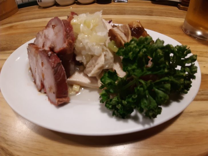 前菜盛合せは3種類盛られていて、自家製チャーシュー、豚の耳の煮こごり、鶏肉のバンバンジーサラダでした。これが、どれも美味しんです。