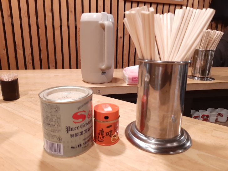 卓上調味料としては、ホワイトペッパーと一味唐辛子が置かれています。