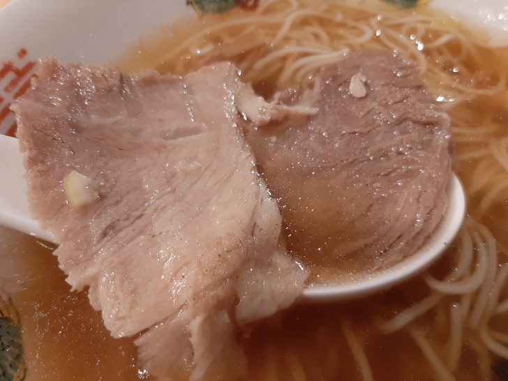 チャーシューは小さめのものが2枚入っています。豚モモ肉のチャーシューはホロッとしているところが良いです。味付けも甘めで美味しいです。