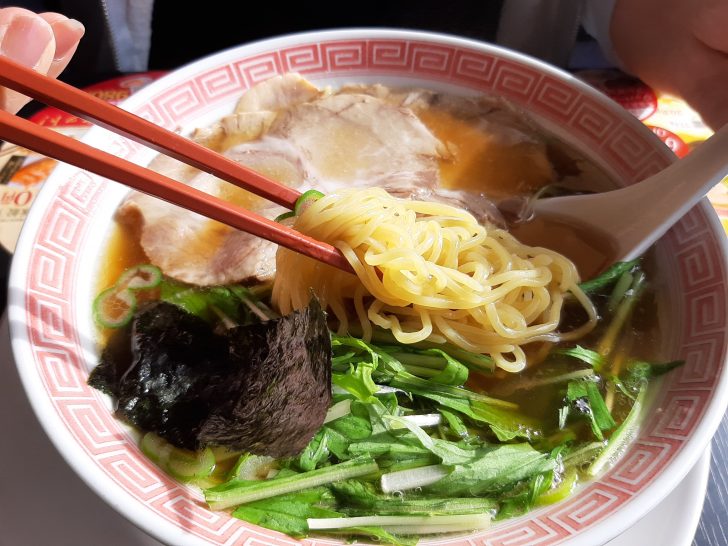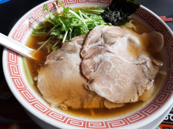 トッピングは、大きなチャーシュー2枚、水菜、のり、ネギです。何故かメンマは入っていませんね。