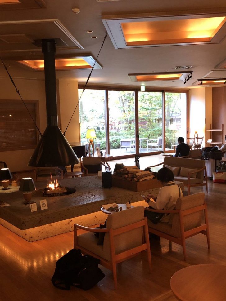 暖炉ラウンジは、ソーシャルディスタンスで、ソファーの配置が変更されていました。暖炉ラウンジにあるジェラートやコーヒー・紅茶、ウイスキーなどがいただけます。