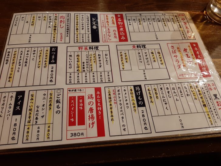 おすすめ料理は、黄色のマーカーで塗られています。名物の肉豆腐、黒おでん、やきとん、肉刺しなどがありますね。