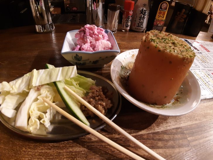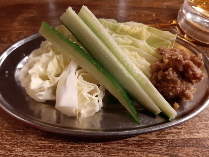 お通しは【300円】です。キャベツとキュウリなのですが、添付の肉味噌が絶品です。これをつけて食べると最高ですね。このお通しであれば、300円でも大満足ですね。