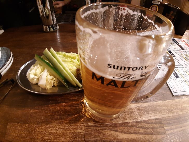 1杯目の飲み物は、サントリーモルツ生ビール(中)【230円】です。撮影を忘れてつい飲んでしまいました。なのでこんな写真になりました。