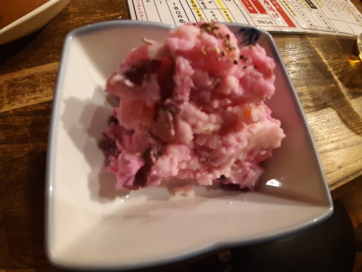 これは、しば漬けポテサラ【280円】です。量も多くて、しば漬けとポテサラとが絶妙に合っていて美味しいです。