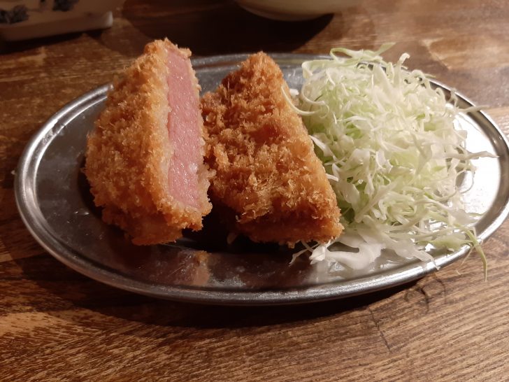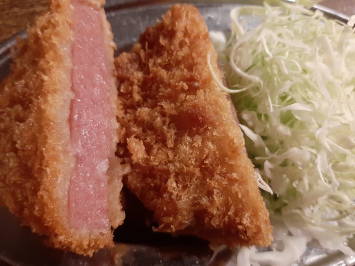 揚げたてのハムカツは、こんなに厚いハムを使っています。これで【280円】はとっても安いですね。味も最高に美味しかったです。