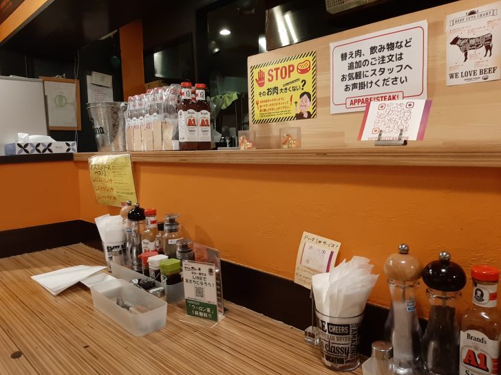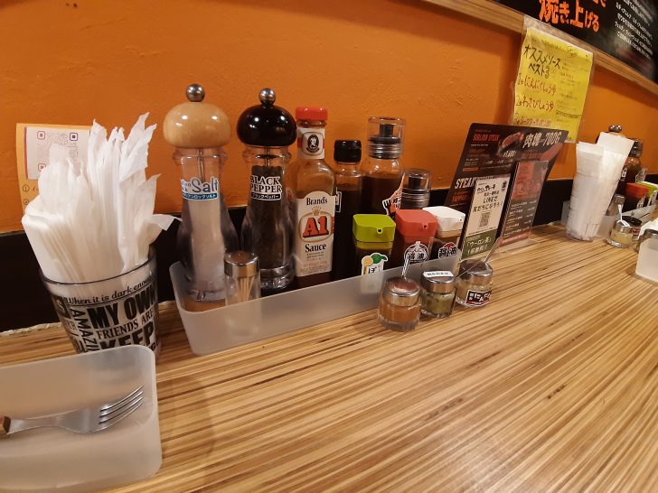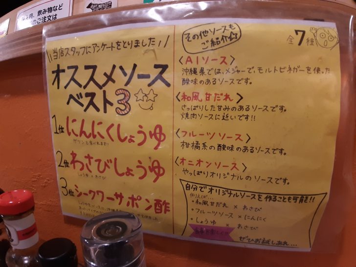 - 和風オニオンソース(オリジナル)、A1、しょうゆ、シークワァーサーポン酢など薬味にわさび、にんにく等の種類豊富なソースがあります。